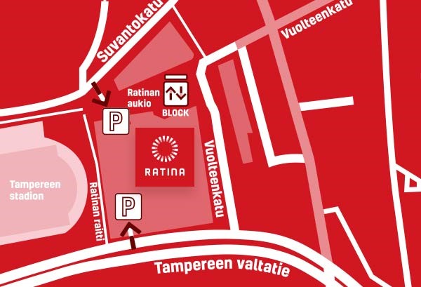 P-Ratinaan ajat helposti Tampereen valtatieltä tai Suvantokadulta, etäopastus pääteiltä auttaa tarvittaessa. Tapahtumien aikana suosittelemme liikenteen ruuhkautumisen helpottamiseksi käyttämään ensisijaisesti P-Ratinan Tampereen valtatien puoleisia sisään- ja ulosajoväyliä. Kahdelta pysäköintitasolta on suora hissiyhteys kauppakeskukseen, josta on lyhyt kävelymatka Nokia Arenalle. Ratinasta löydät myös lukuisia kahviloita ja ravintoloita, jonne ovat lämpimästi tervetulleita kaikkien joukkueiden kannattajat ja muut tapahtumavieraat.