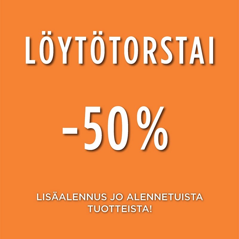 Löytötorstai -50%! Saat jo alennetuista löytöpisteen tuotteista -50% lisäalennuksen! Nyt pidennettynä sunnuntaihin asti! Tuotteet merkitty erikseen.
