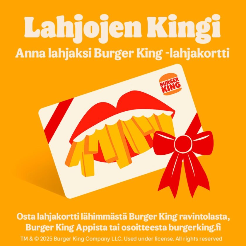 Joulun Kingein lahja! Lahjakortin ostat kätevästi Burger King ravintolasta, Burger King Appista tai osoitteesta burgerking.fi. Anna lahja, joka todella maistuu!