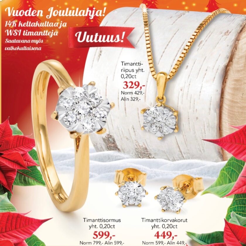 Upea ”vuoden joululahja 2025” timanttikorut tarjoushinnoin 24.12. asti. Saatavana kelta- ja valkokultaisena.