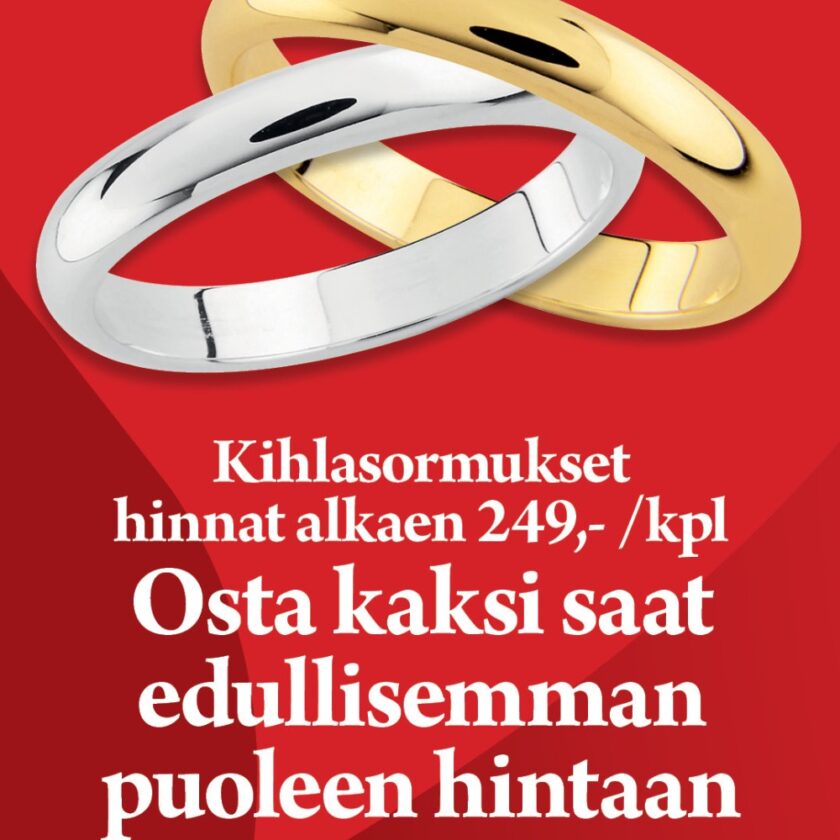 AuMore kelta- ja valkokultaiset kihlasormukset alkaen 249€/kpl Osta kaksi AuMore sormusta, saat edullisemman puoleen hintaan! Tarjous voimassa 24.12.2025 asti.