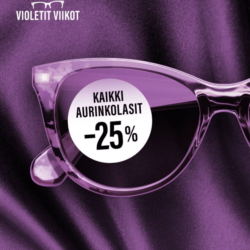Aurinkolasit –25 % Silmäasemalla Violettien viikkojen kunniaksi kaikki aurinkolasit voimakkuuksilla tai ilman 25 prosentin alennuksella. Tervetuloa – myymälä on täynnä huipputarjouksia!