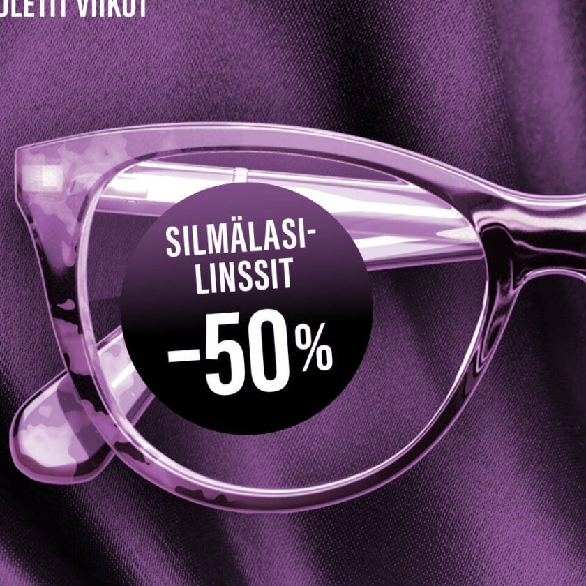 Silmäasemalla on nyt Violetit viikot! Juuri nyt saat mitkä tahansa silmälasilinssit 50 prosentin alennuksella. Maksuton optikon näöntutkimus silmälasien ostajalle. Tervetuloa – myymälä on täynnä huipputarjouksia!