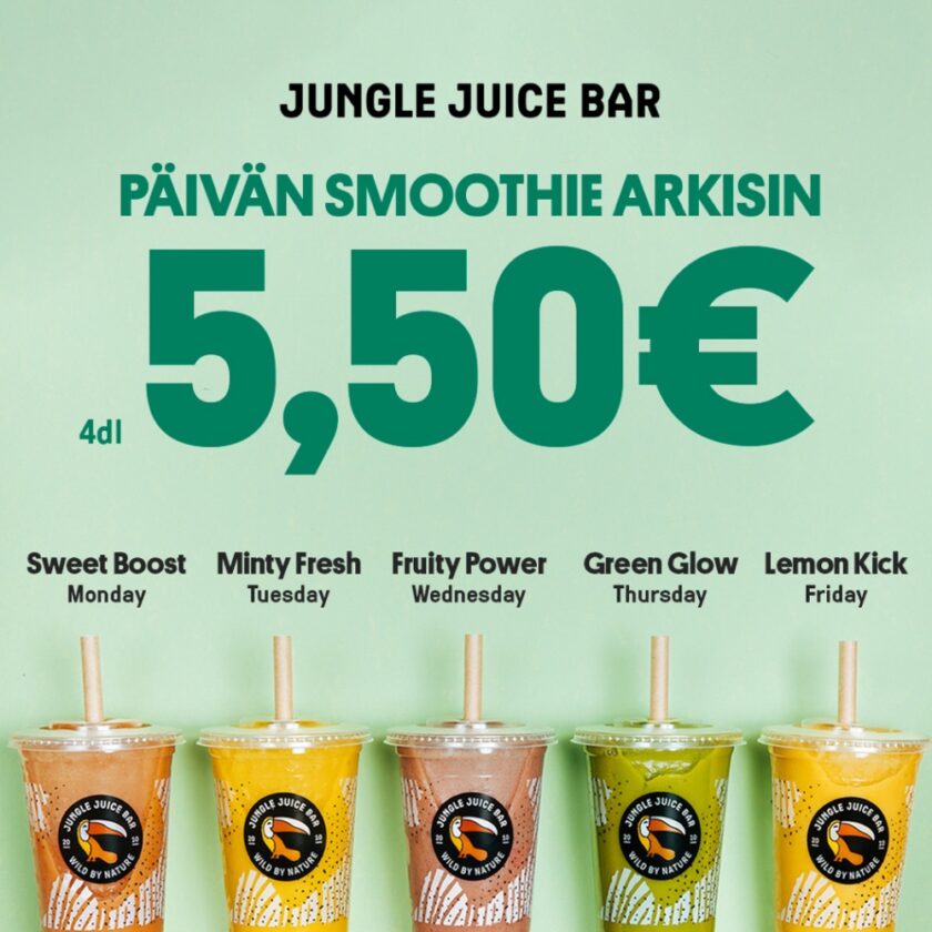 Nyt meiltä saa jokaisena arkipäivänä herkullisen smoothien, joka maksaa vain 5,50€ (4dl, isompi koko vain +1,50€). Maanantai Sweet Boost, tiistai Minty Fresh, keskiviikko Fruity Power, torstai Green Glow, perjantai Lemon Kick. Maista ja ihastu!