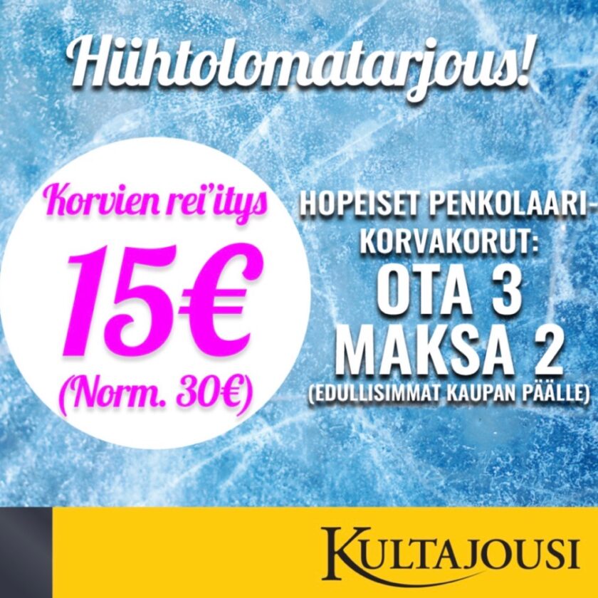 Hiihtolomatarjous 14.2.-8.3. Korvien rei’itys 15€ (norm.30€) Hinta sisältää kirurginteräksiset ensikorvikset.