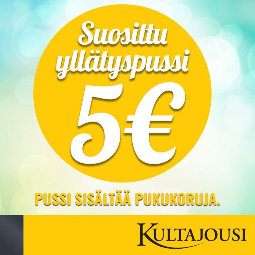 Suosittu yllätyspussi vain 5 €! Pussi sisältää ihania pukukoruja – täydellinen pieni ilo itselle tai lahjaksi. ✨ Tarjous on voimassa kaikissa Suomen Kultajousi-myymälöissä.