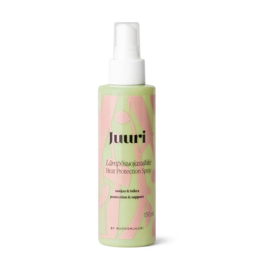Juuri, kun hiuksesi kaipaavat suojaa kuumuudelta. Juuri Lämpösuojasuihke auttaa suojaamaan hiuksia föönin, kihartimen ja suoristusraudan lämmöltä – samalla kun se siloittaa ja vähentää pörröisyyttä. 150 ml.