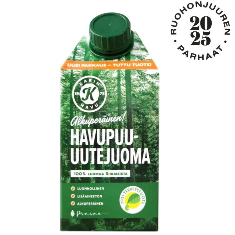 Luomusertifioitu ja kotimainen havupuu-uutejuoma valmistetaan puhtaasta lähdevedestä, nuoren männyn kuoresta ja nilasta. 500 ml.
