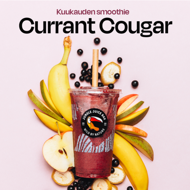 Tässä raikkaassa, ihanassa makukombossa leikitellään lakulla ja C-vitamiinipitoisella suomalaisella mustaherukalla. Ainesosat: mustaherukka, päärynä, raakalaku, banaani, mango, omena,jäitä. 4dl 6,99€ ja 6dl 8,49€.