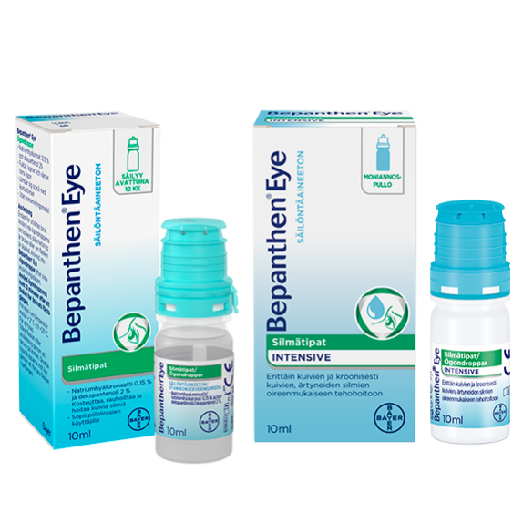 Bepanthen Eye -silmätipat lievittävät kuivien, ärtyneiden ja väsyneiden silmien ikäviä oireita heti, voitelemalla silmän pintaa ja suojaamalla sitä kuivumiselta pitkäaikaisesti. Bepanthen Eye Intensive tehokosteutus erittäin kuiville silmille. 10 ml