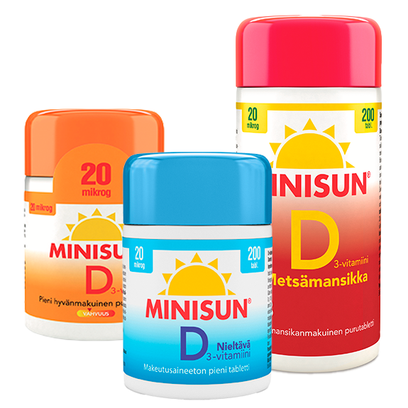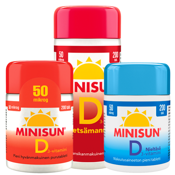 Suomessa kehitetyistä Minisun D-vitamiinivalmisteista löytyy sopiva tuote jokaiselle ja ne ovat helppo tapa varmistaa riittävä D-vitamiinin saanti ympäri vuoden. Saatavilla myös nieltävä neutraali D-vitamiinivalmiste! 200 tabl.