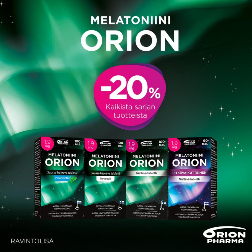 Kaikki Orionin Melatoniinivalmisteet helmikuussa -20%. Melatoniini auttaa lyhentämään nukahtamisaikaa ja lievittämään aikaeron yksilöllisiä vaikutuksia.