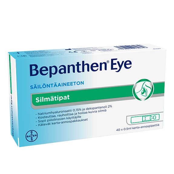 Bepanthen Eye -silmätipat lievittävät kuivien, ärtyneiden ja väsyneiden silmien ikäviä oireita heti, voitelemalla silmän pintaa ja suojaamalla sitä kuivumiselta pitkäaikaisesti. 40x0,5 ml kerta-annospipetit.