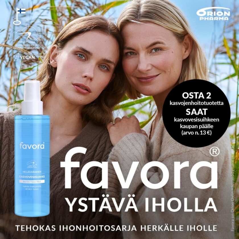 kaupan päälleOstamalla 2 Favora -kasvojenhoitotuotetta saat Favoran kasvosuihkeen 200 ml kaupan päälle!