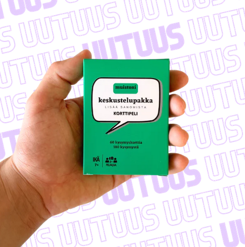 Keskustelupakka Muistoni saattelee sinut keskusteluihin kultaisista muistoistasi. Sisältää 60 kysymyskorttia, joissa on 180 kysymystä ohjaamassa keskusteluanne elämän matkan hauskoihin, merkittäviin ja tunteikkaisiin hetkiin ja tapahtumiin.