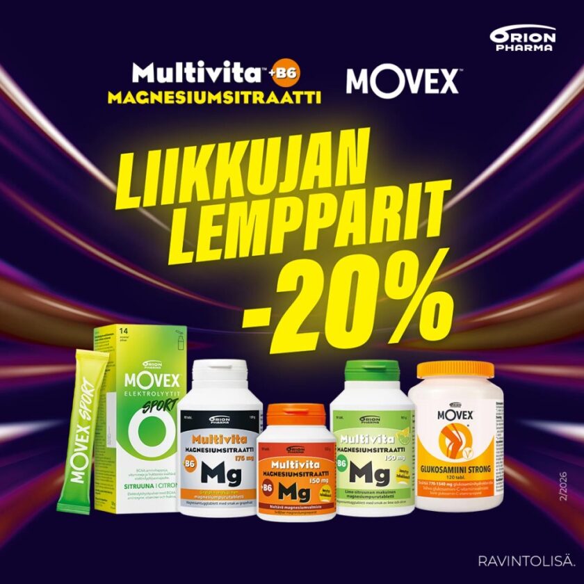 Energiaa liikkeeseen ja voimaa palautumiseen Liikkujan lemppareista! Multivita Magnesiumsitraatti +B6- ja Movex-sarjan tuotteet nyt kampanjatarjouksessa -20 %.